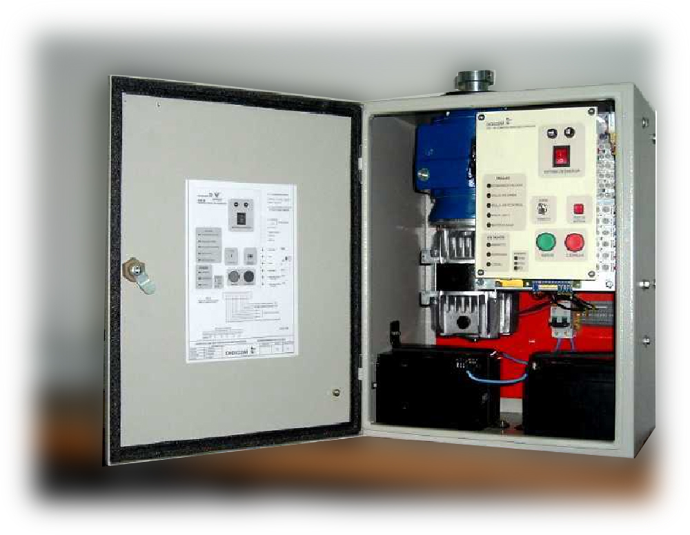 El conjunto está montado y completamente contenido en gabinete estanco de acero reforzado con perfiles, pintado al horno, con respaldo de montaje y collar de anclaje y tiene un mecanismo de desacople para la acción manual.